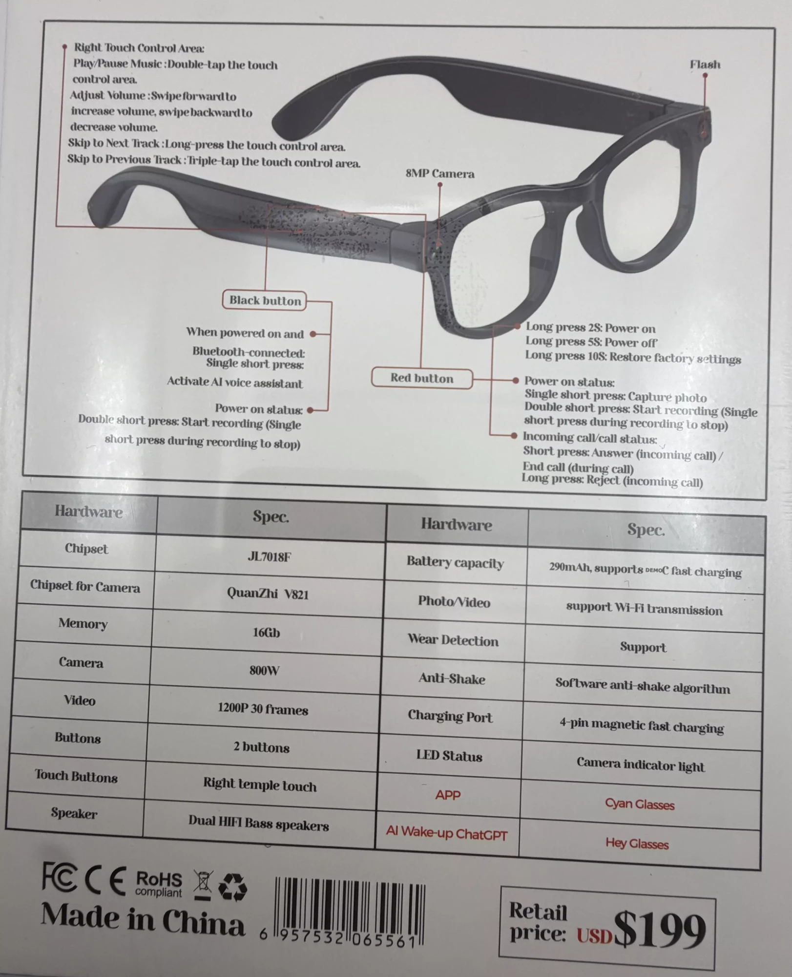 Ces lunettes intègrent une connexion Bluetooth stable, une batterie rechargeable, des commandes discrètes intégrées à la monture et un système audio conçu pour une écoute personnelle. L’ensemble est pensé pour un usage régulier, simple et intuitif.